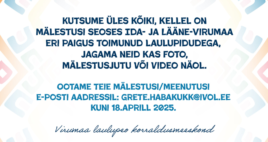 Meil on laulud, mida laulda. Meil on lood, mida jutustada. Meie oma inimesed, meie oma laulupidu. Üks, oma ja meie Virumaa laulupidu.