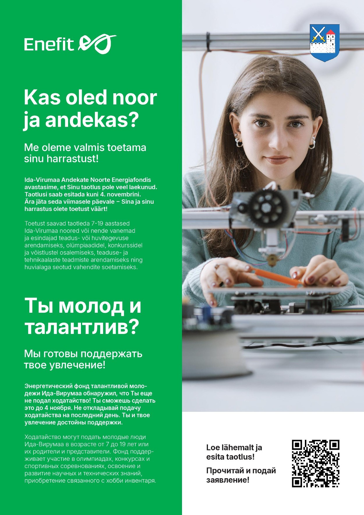 Alates 6. oktoobrist saab taotlusi esitada Andekate Noorte Energiafondi (ANEF) järjekordsesse taotlusvooru. ANEF ootab taotlusi Ida-Virumaa noortelt, kes soovivad saada rahalist toetust enesearendamiseks, sh huvitegevuseks, teaduseks ja sportimiseks. Eesti Energia ja Ida-Virumaa Omavalitsuste Liidu (IVOL) loodud ühisfondi taotlusvoor jääb avatuks kuni 4. novembrini ning toetused jagatakse välja detsembris.