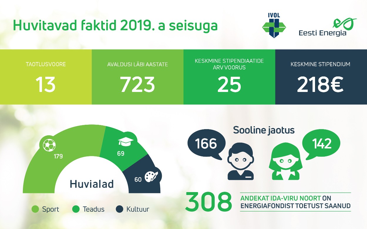 Eesti Energia ja Ida-Virumaa Omavalitsuste Liidu (IVOL) loodud ühisfondist soovis huvitegevuseks toetust saada 76 Ida-Virumaa noort vanuses 7-19 eluaastat. Žürii valitud stipendiumisaajad selguvad hiljemalt 3. detsembriks ning saavad tunnustatud detsembris toimuval üritusel.