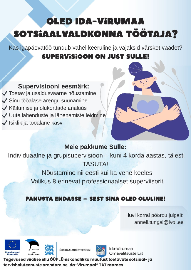 Oled Ida-Virumaa sotsiaalvaldkonna töötaja? Just praegu on õige aeg panustada endasse ning kasutada tasuta supervisiooni! Võta julgelt ühendust ja küsi lisa:
